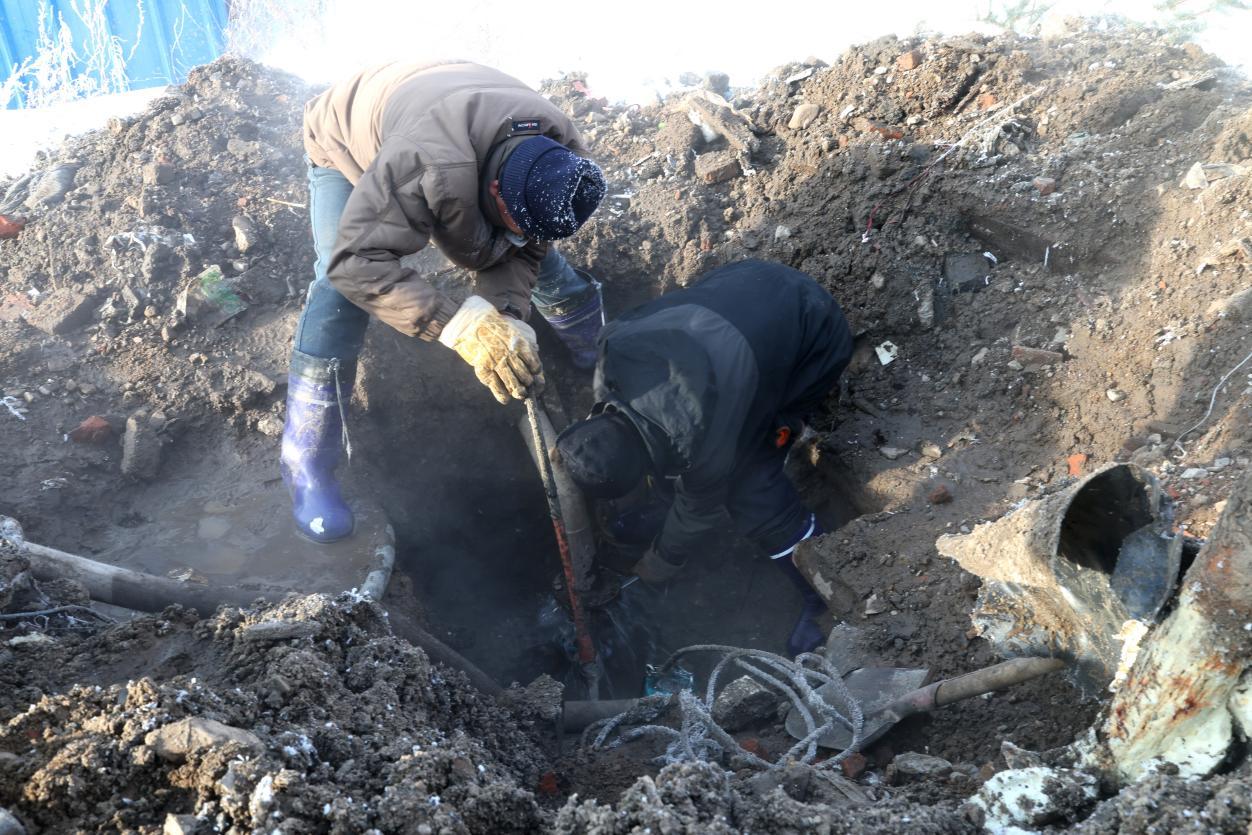 因地下管線錯(cuò)綜復(fù)雜,且極寒天氣易導(dǎo)致管道凍裂,搶修人員采取邊供暖、邊排水、邊人工開挖的方式推進(jìn)作業(yè),防止管線被凍擴(kuò)大輻射面。地面破開后熱水持續(xù)涌出,搶修人員輪番上陣,清理凍土、排查漏點(diǎn),歷經(jīng)3小時(shí)奮戰(zhàn),至11時(shí)40分挖出1.8立方米深坑,精準(zhǔn)定位漏點(diǎn)為供暖分線軟接頭老化,此時(shí)跑水量已達(dá)每小時(shí)4噸。為控制漏損,搶修人員當(dāng)即關(guān)閉分線閥門,受此影響,周邊20余戶居民供暖暫時(shí)中斷。