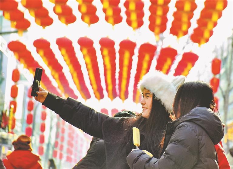2月10日,北方小年,為迎接新春佳節(jié)的到來,哈爾濱市道外區(qū)南三道街懸掛了近千盞紅燈籠,喜慶氣氛濃厚。在一排排大紅燈籠下面,有的游客在拍照,有的游客在觀賞風景。