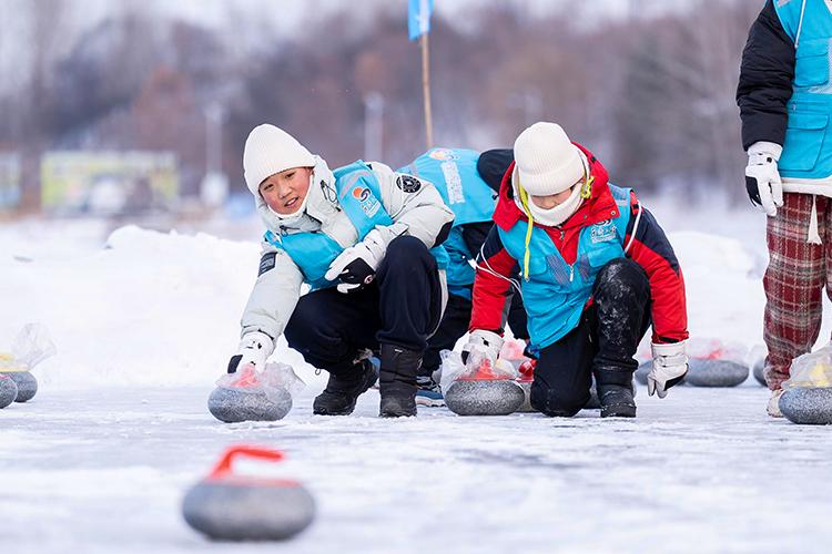 希望與愛手拉手主題公益研學活動中,孩子們玩室外冰壺