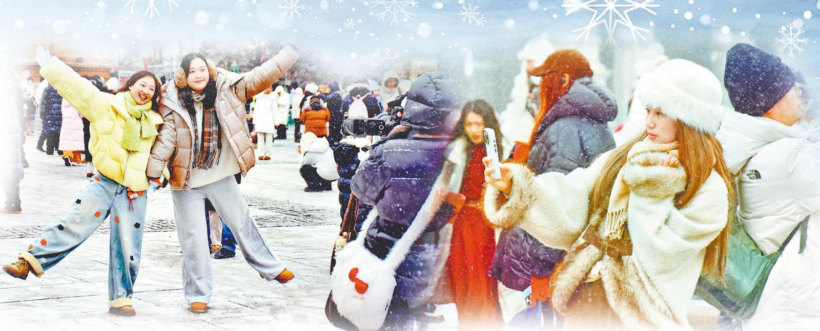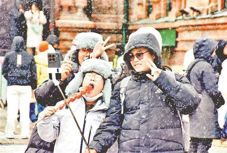 17日,正月初一。哈爾濱市迎來(lái)了降雪天氣。樹上、車上、建筑上、道路上都落了一層白雪,為節(jié)日里的冰城增添了更多魅力。在各處景點(diǎn),市民和游客在雪中拍照、玩耍,盡享降雪帶來(lái)的快樂(lè)。