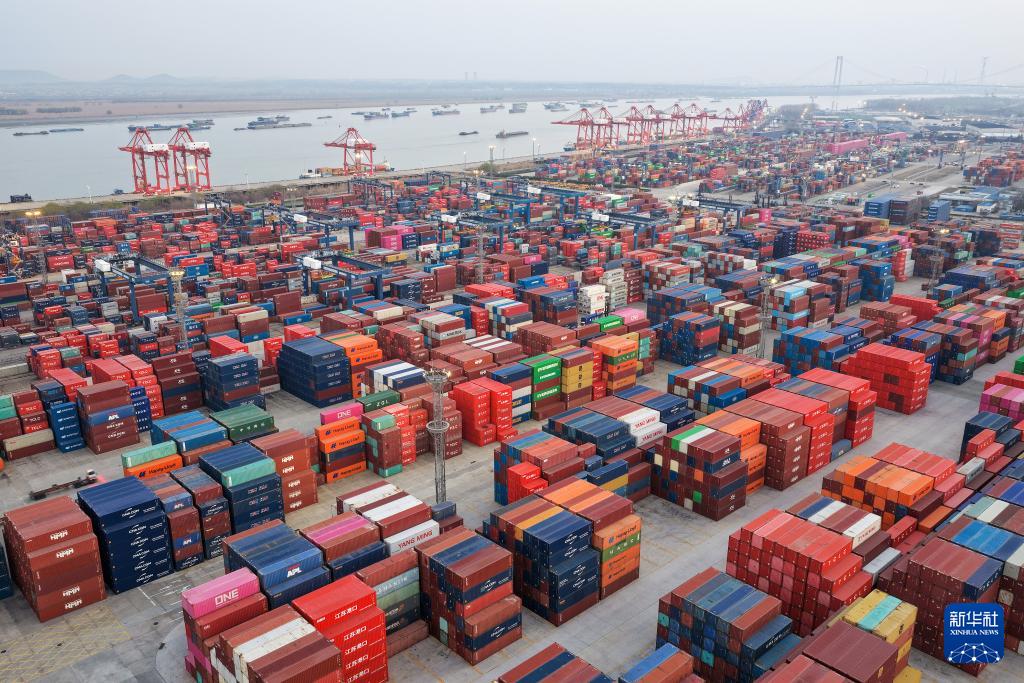 ??3月10日拍攝的江蘇省港口集團南京港龍?zhí)都b箱碼頭(無人機照片)。新華社發(fā)(方東旭攝)