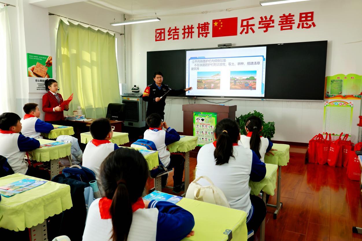 漠河站鐵路派出所的干警在向小學五年級學生講解鐵路安全注意事項(王力 攝)